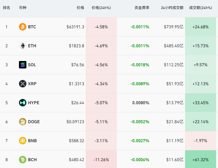 2026-02-26交易所,交易所排名,交易所排行,加密货币是什么,加密货币交易平台,加密货币平台,币安交易所,火币交易所,欧意交易所,Bybit,Coinbase,Bitget,Kraken,全球交易所排名,交易所排行2月24日比特币延续跌势,截至18:40,24小时内跌幅超4.5%,一度失守6.3万美元重要关口。与此同时,其他主要虚拟币集体杀跌,以太坊跌近5%,失守1900美元。