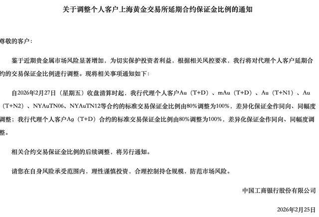 同日,工商银行亦宣布,自2026年2月27日(星期五)收盘清算时起,该行代理个人客户Au(T+D)、mAu(T+D)、Au(T+N1)、Au(T+N2)、NYAuTN06、NYAuTN12等合约的标准交易保证金比例由80%调整为100%,差异化保证金作同向、同幅度调整;该行代理个人客户Ag(T+D)合约的标准交易保证金比例由80%调整为100%,差异化保证金作同向、同幅度调整。