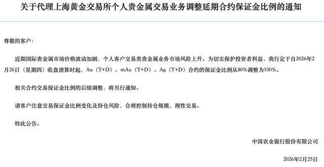 2月25日,农业银行发布《关于代理上海黄金交易所个人贵金属交易业务调整延期合约保证金比例的通知》,自2026年2月26日(星期四)收盘清算时起,Au(T+D)、mAu(T+D)、Ag(T+D)合约保证金比例从80%调整为100%(备注:Au代表黄金;Ag代表白银;“T+D”指延期交易)。