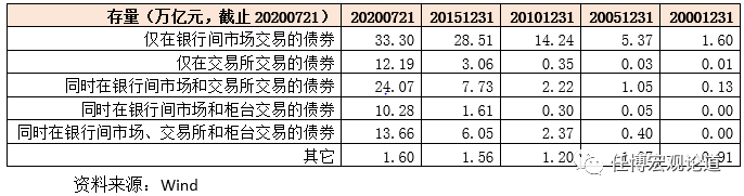 1、从规模上来看,截至2020年7月21日底我国债券市场规模为106.06万亿元,其中仅在银行间市场和仅在交易所市场交易的债券规模分别为33.30万亿和12.19万亿元,同时在银行间和交易所市场交易的债券余额为24.07万亿元。