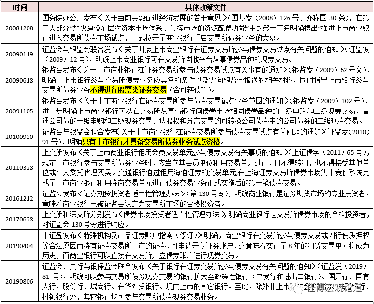 1、自2008年12月8日国务院明确提出“推进上市商业银行进入交易所债券市场试点”以来,监管部门便开始采取行动,逐步放开商业银行参与交易所债券现券交易的政策约束,允许商业银行逐步参与交易所债券市场业务。不过这一过程却呈现出阶段性特征,即2008-2011年期间证监会和银监会联合采取行动(连发五份政策文件)、2012-2015年期间政策层面较为平静、2016-2018年期间银监会较为平静而证监会则继续主动、2019年以来证监会和银保监会等政策部门再次联合行动等四个阶段。