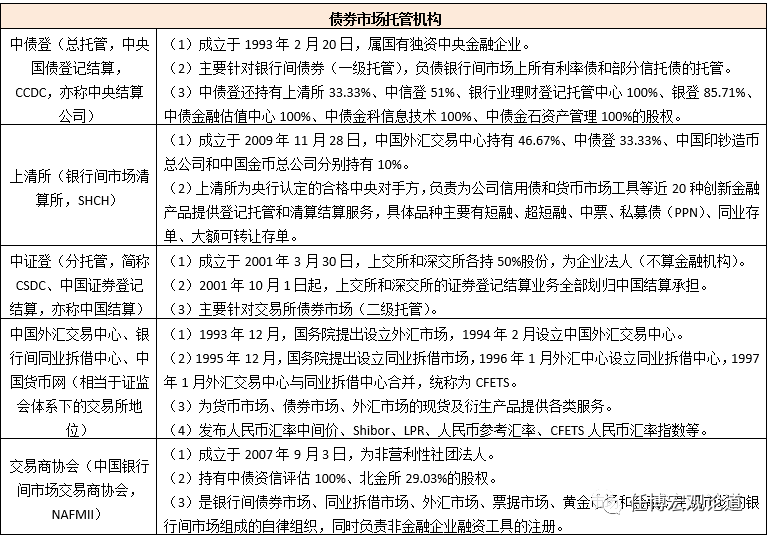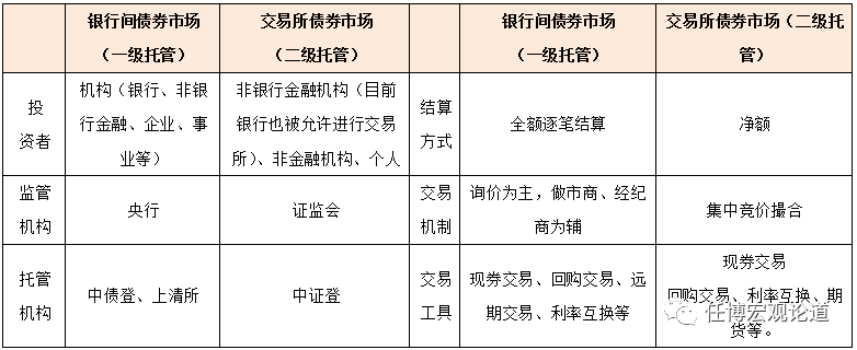 3、从登记、托管与结算机构来看,银行间债券市场为中债登和上清所,交易所债券市场为中证登。