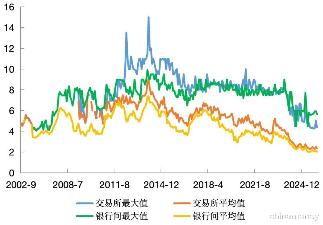 债券一级市场定价方面,交易所市场和银行间市场的票面利率统计情况如图3所示,2018年初至2023年中后期,两个市场的月度票面利率最大值基本均维持在8%~9%,波动弹性不足。2018年民企大量违约,此后多年弱资质发行主体的债券一级定价基本上流于形式,出现了明显的价格双轨制,票面利率远远无法反映实际融资成本,这一现象直到2023年9月私募基金条例出台与2023年下半年国家化债政策推出后方得到缓解。