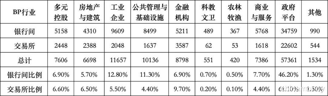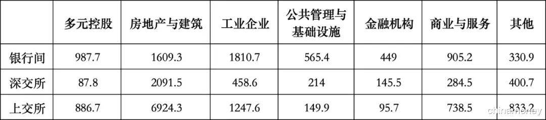 为分析两个市场的发行主体特征,笔者利用自建的第三方“BP评级估值定价模型”中BP行业与BP评级信息,对112,147只债券的发行主体进行信用评级、行业属性统计,结果如表2所示,银行间债券市场发行主体的信用评级整体更高,高(1-4)、中(5-7)、低(8-10)信用评级的债券发行比例分别为40.6%、49.8%、9.5%,交易所相应数据则为31.0%、52.0%、17.0%,这一结果也与上文中估计的投资者结构比例相符。