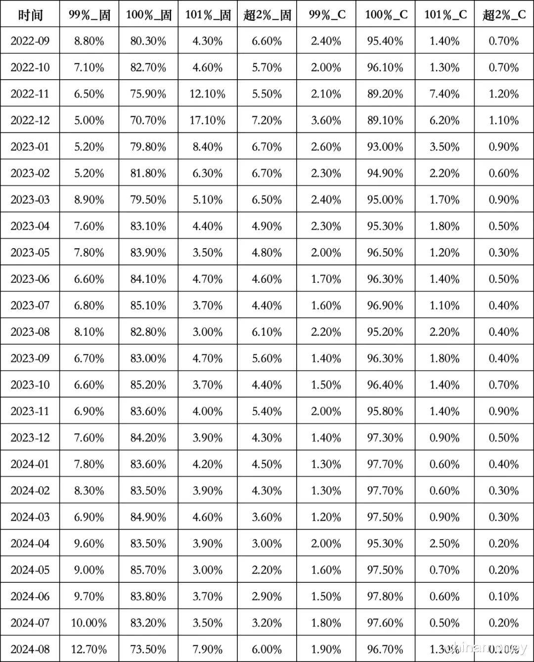 二级市场定价效率上,本文采用“交易净价偏离=成交净价/基准净价估值”来进行衡量,以国内私募基金条例出台的2023年9月为分隔时点前后延伸一年做统计,如表4所示,不同偏离幅度维度下,近年来银行间市场债券的交易净价偏离明显小于交易所市场债券,且在99%偏离分位处差异较大,这说明银行间市场的二级市场定价效率要高于交易所市场。