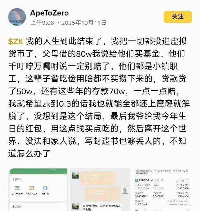 网上也有一个网友发帖称,人生到此结束了,我把一切都投进了虚拟币,父母给了80万,骗父母说给他们买基金,父母千叮万嘱说让他不要赔了。然后自己贷款了50万,还有自己这些年的存款70万。一点一点的赔,希望做空到0.3,他就可以全部能还上窟窿解脱,但是现在没想到是这个结局。这次爷爷给他一个生日红包,博主说用这点钱买点吃的,然后离开世界。