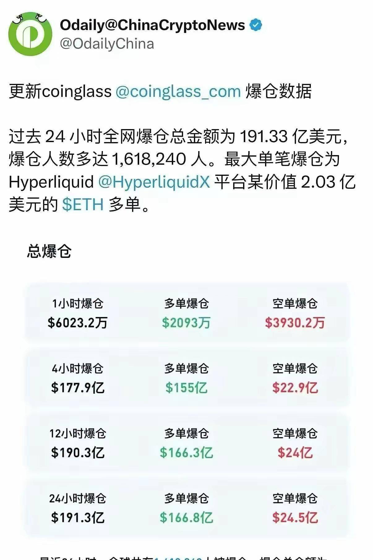 据加密货币数据平台Coinglass统计,24小时内全球加密货币市场爆仓额达193.58亿美元,约166万交易者被迫平仓离场,也就是说这166万交易者失去了所有,不仅失去自己的财富,还有别人让他们投资的也都平仓了。