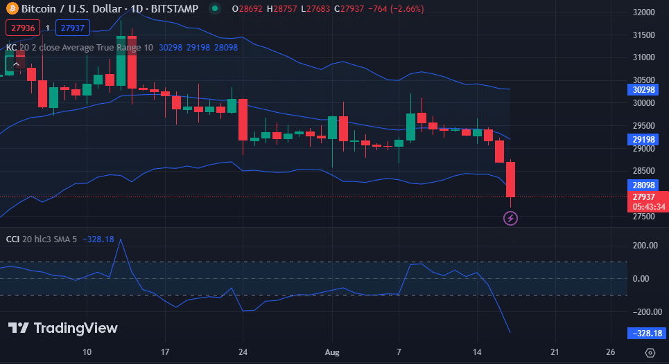 8 月 16 日公布的最新美联储会议纪要进一步加剧了比特币空头的关注焦点,买方兴趣下降,导致 BTC/USD 跌至近两个月低点 28,300 美元。