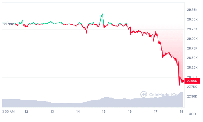 尽管长期横盘整理,比特币的稳定性现在受到了威胁。当前支撑位为27,718.15美元,阻力位为29,192.26美元。比特币24小时交易量为21,294,148,208美元,最后一天下跌3.75%。尽管有所下跌,比特币仍然是排名第一的加密货币,其实时市值为 543,844,429,644 美元。